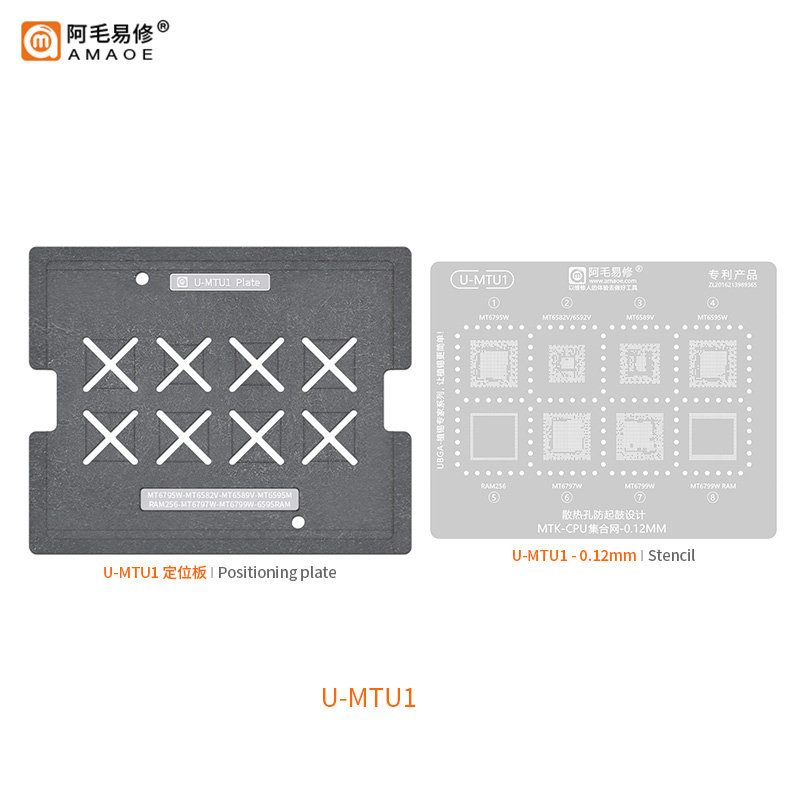 AMAOE U-MTU1 is a high-precision UBGA series BGA reballing stencil tailored for MediaTek (MTK) CPUs and RAM ICs. Crafted with 0.12mm half-etched mesh and matched with a laser-cut positioning plate, the U-MTU1 ensures accurate and consistent solder ball alignment for critical chip-level repair work.