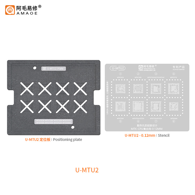 AMAOE U-MTU2 is a high-precision 0.12mm BGA reballing stencil designed for MediaTek (MTK) CPU chipsets, part of AMAOE’s professional UBGA stencil series. Featuring laser-etched, anti-warp mesh, the U-MTU2 offers exceptional tin planting accuracy and consistent performance in chip-level repair and reballing. Whether you're refurbishing Android devices or reballing failed MTK processors, this stencil supports a wide range of CPUs including MT6758V, MT6750, MT6757V, MT6580A, MT6735, MT6732, and more. Its layout is organized for efficiency, reducing rework and boosting solder success rates.