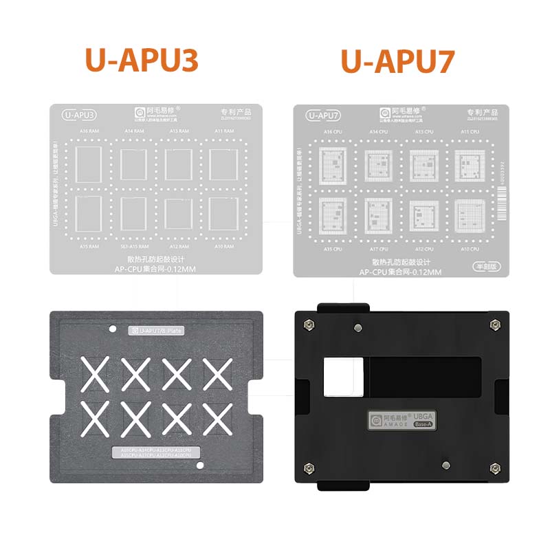 AMAOE U-APU Series is a specialized line of BGA reballing stencils and platforms designed exclusively for Apple A-Series CPUs and RAM ICs. These stencils cover a wide range of iPhone and iPad chipsets, enabling professional technicians to perform highly precise reballing and IC repairs on Apple logic boards. Each stencil is made with 0.12mm high-precision steel mesh, optimized for CPU/RAM soldering. The UBGA Base-A platform and alignment plates ensure stability, accuracy, and repeatability—making these kits ideal for chip-level iPhone repair professionals.