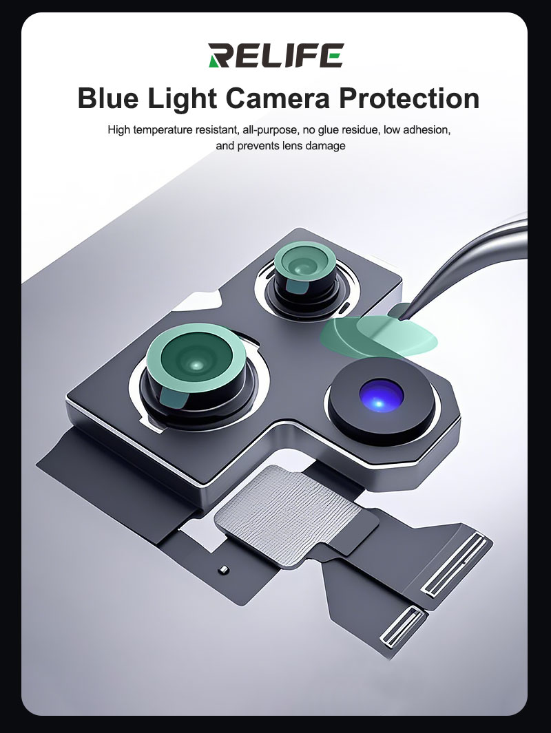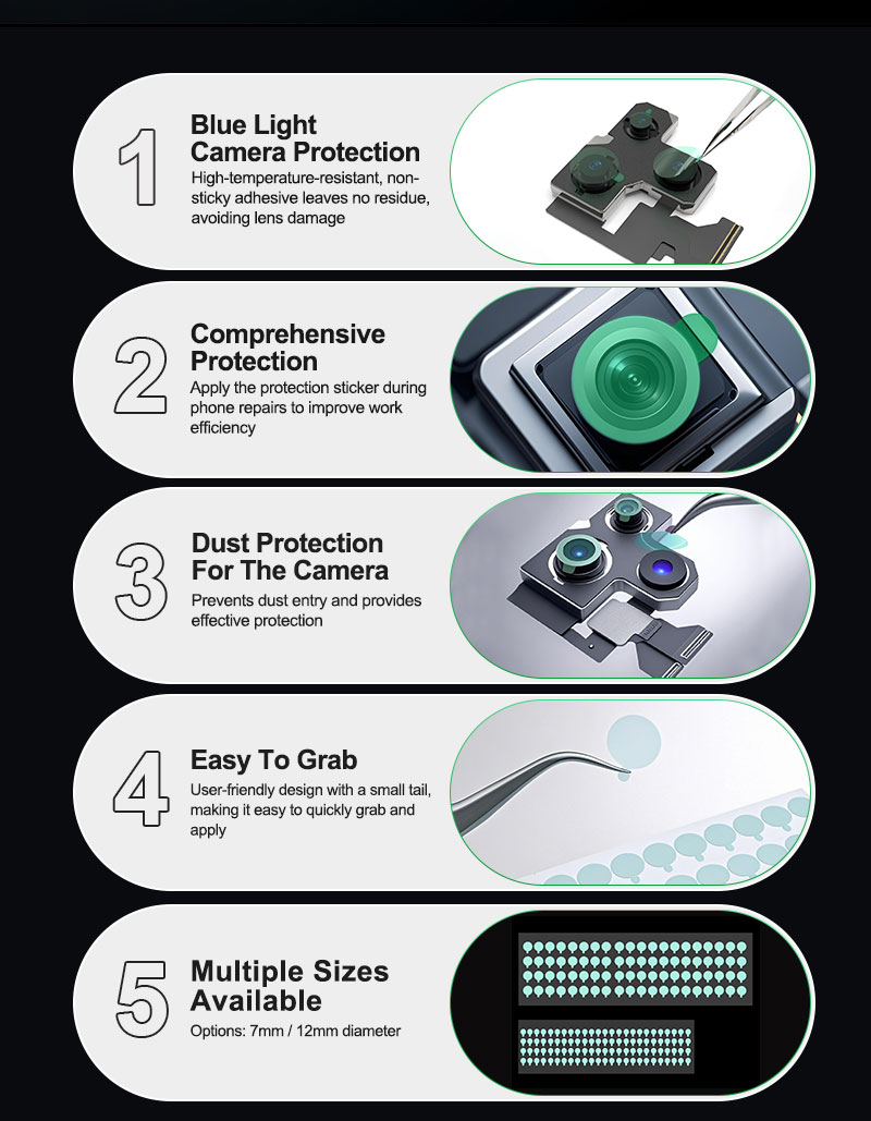 The Camera Lens Protective Sticker is designed to safeguard your device’s camera module during repair or maintenance. Its upgraded green film protects against blue light damage, prevents dust entry, and avoids accidental contact with sensitive components such as the infrared dot-matrix system—helping prevent issues like Face ID failure.