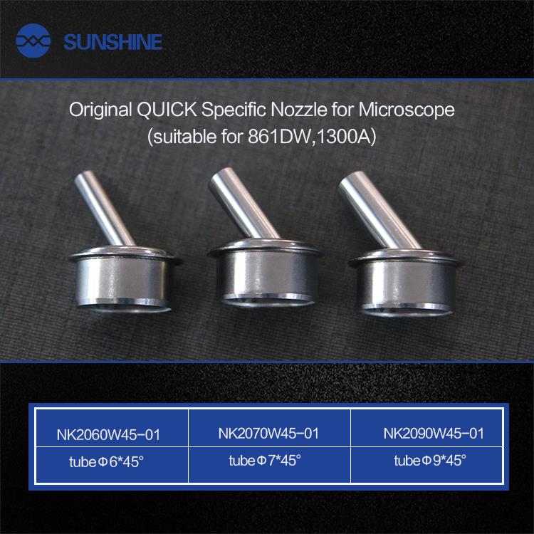 QUICK 861DW bent air nozzles (NK2060W45–01, NK2070W45–01, NK2090W45–01) is ideal for precision soldering under microscopes with 45° angled airflow. Compatible with 861DW, 1300A, and other QUICK hot air rework stations. Available in 6mm, 7mm, and 9mm. Durable stainless steel, perfect for mobile repair labs and motherboard work.