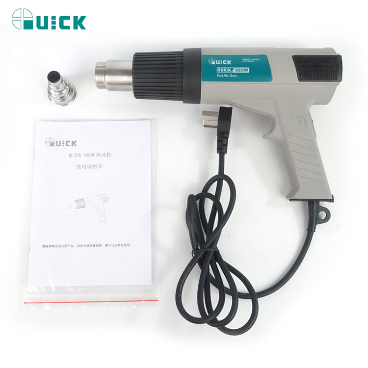 QUICK 885W Handheld Heat Gun is a high-performance, professional-grade hot air tool designed for mobile repair, electronics desoldering, heat shrink applications, and industrial usage. Powered by an 1800W heating system with dual eddy current brushless fan technology, it ensures stable airflow, long service life, and low noise operation. Equipped with digital temperature calibration and a real-time LCD display, technicians can adjust temperature precisely from 100°C to 600°C with fast heating response. Its intelligent cooling and sleep function extend the life of the ceramic heating element while ensuring energy efficiency.