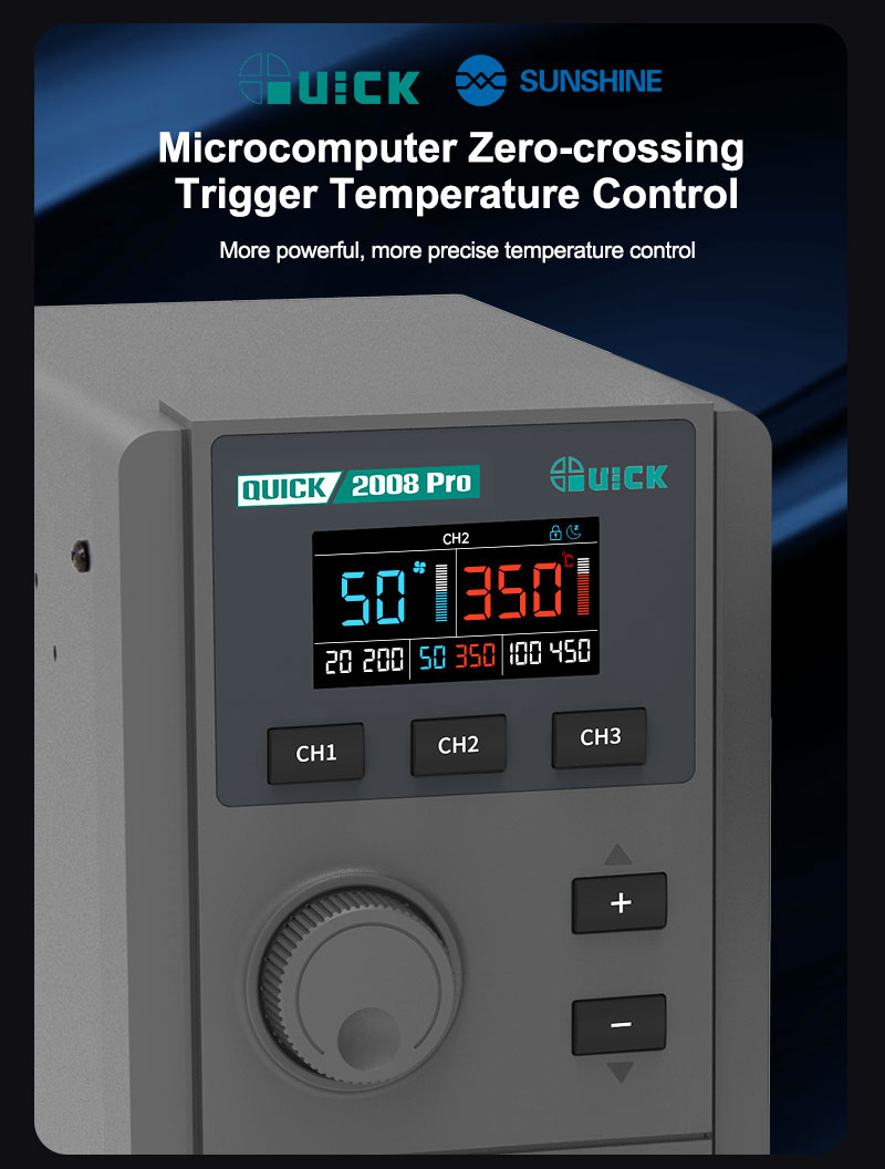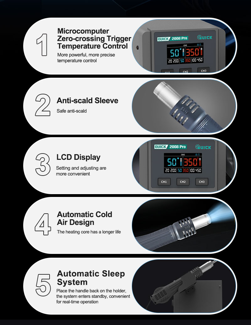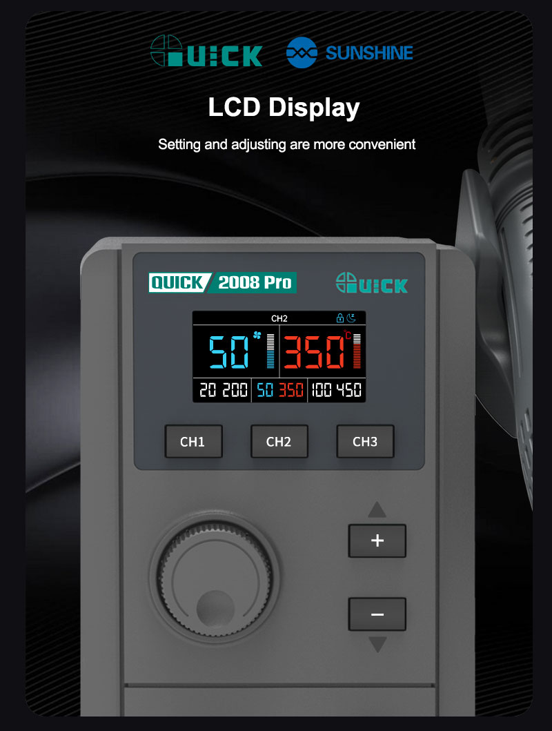 The Quick 2008 Pro is a high-performance 750W lead-free hot air rework station designed for professional mobile repair, motherboard soldering, IC removal, and precision electronics work. Featuring intelligent digital temperature control, fast heating, and stable airflow, this hot air gun ensures efficient, safe, and accurate repair results for technicians and repair labs.