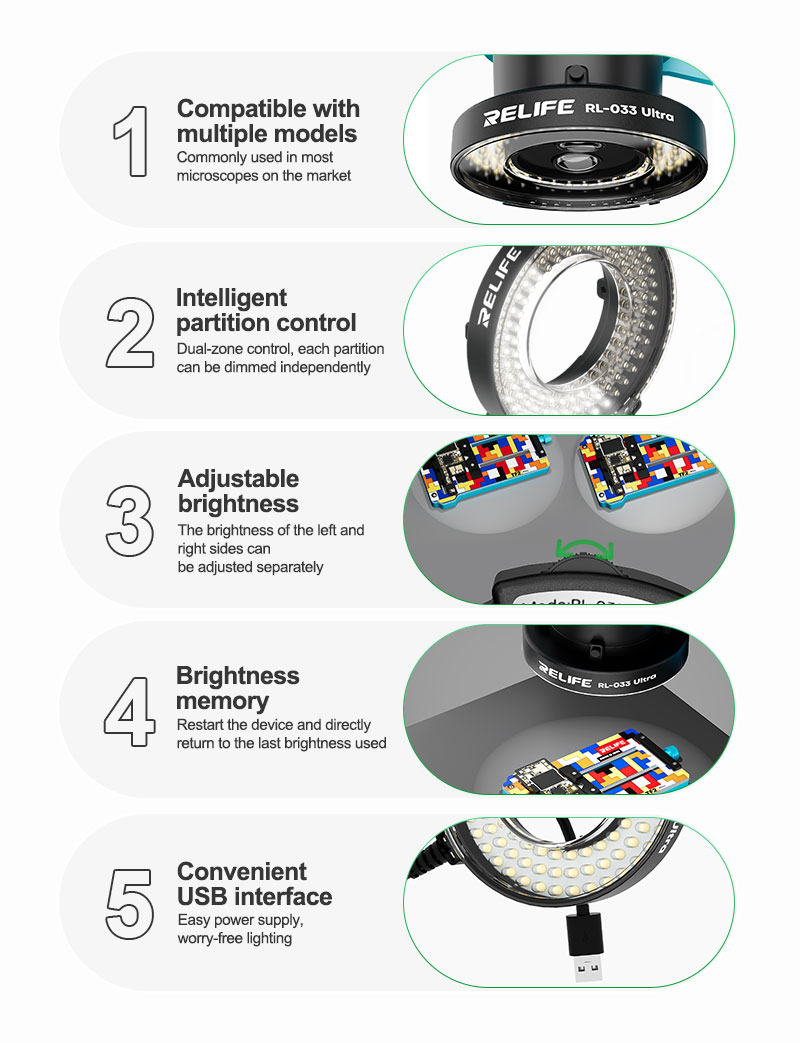 Featuring powerful LEDs with adjustable brightness and a 360° light ring design, this lighting accessory enhances clarity, reduces eye strain, and supports professional repair performance.