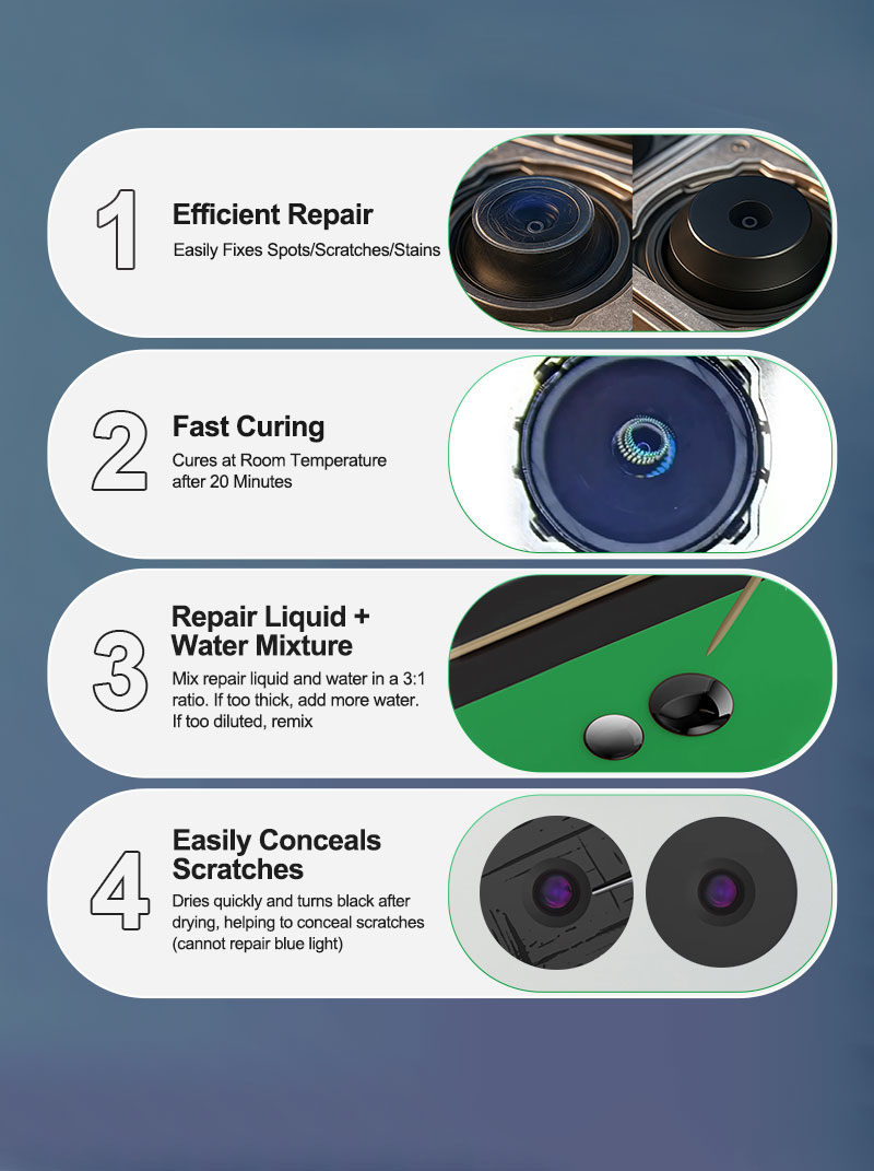 Its fast-penetrating formula is designed to dissolve internal haze, remove surface impurities, and eliminate blue-light distortion. The repair liquid evaporates cleanly, leaving no residue and ensuring safe use on sensitive optical modules, sensors, and lenses.
