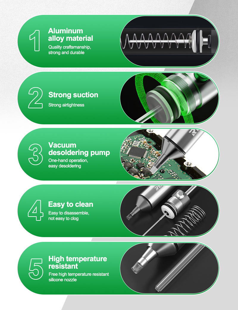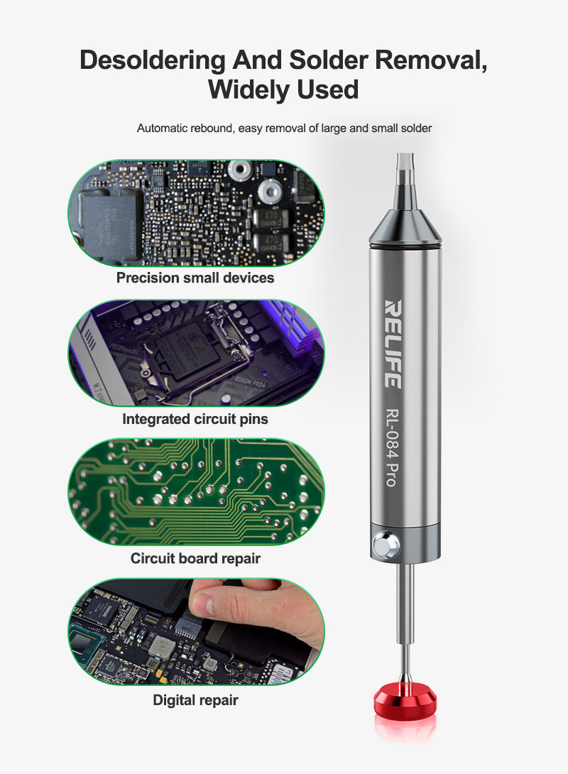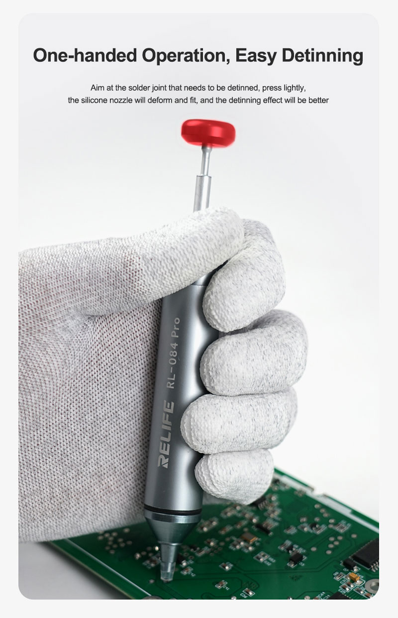 Its upgraded anti-scalding design ensures safe operation even during high-temperature soldering tasks. The powerful suction mechanism efficiently removes molten solder, reducing clean-up time and improving workflow efficiency. With an ergonomic grip and smooth spring action, the RL-084 Pro delivers consistent performance for both beginners and expert technicians.