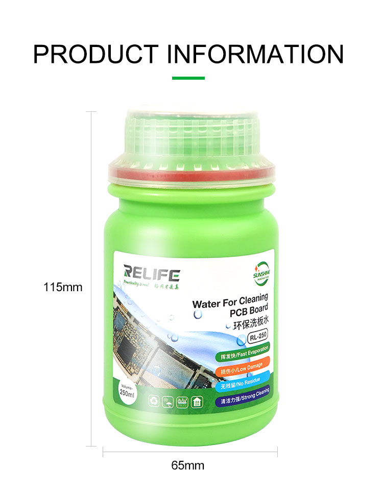 The RELIFE RL-250 Water for PCB Board is a high-performance cleaning liquid formulated specifically for delicate electronic circuit boards. It is engineered to dissolve and remove solder flux residue, fingerprints, dust, oxidation marks, and other impurities without damaging components.