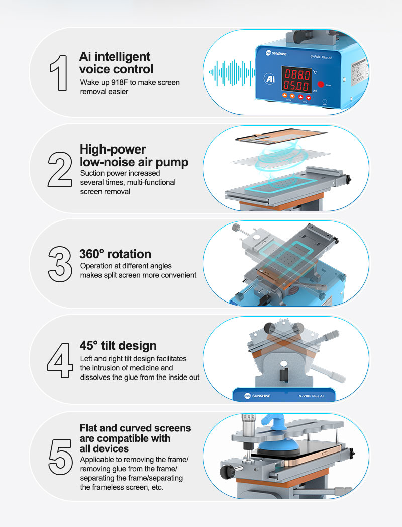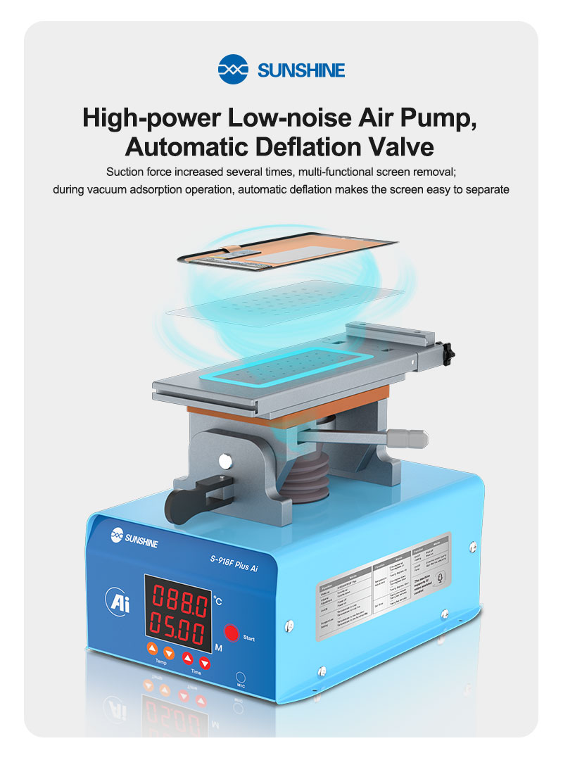 The SUNSHINE S-918F Plus AI 5-in-1 Intelligent Screen Separator Machine is a next-generation tool engineered for technicians who demand accuracy, safety, and speed during mobile screen repair.