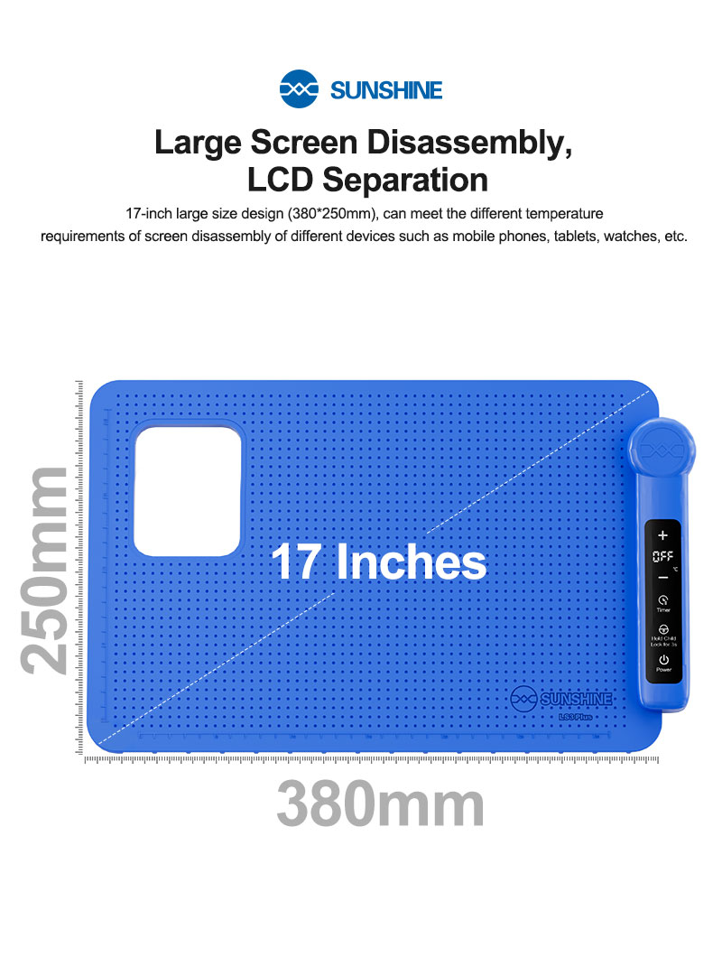 The Sunshine LS3 Plus 17-Inch LCD Screen Separator Pad is a professional high-temperature heating platform designed for mobile phone display separation, adhesive softening, and LCD repair work. With a large 17-inch workspace, it supports a wide range of devices including smartphones, tablets, iPads, and other flat panels.