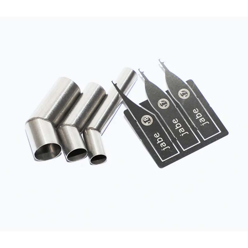 Upgrade your hot air rework setup with the Universal Bent Nozzle JABE Set, designed specifically for mobile phone motherboard repair, soldering, and desoldering ICs under a microscope. This complete kit includes three 45° angled nozzles of different diameters along with precision JABE blades that help shield surrounding components during heat application.